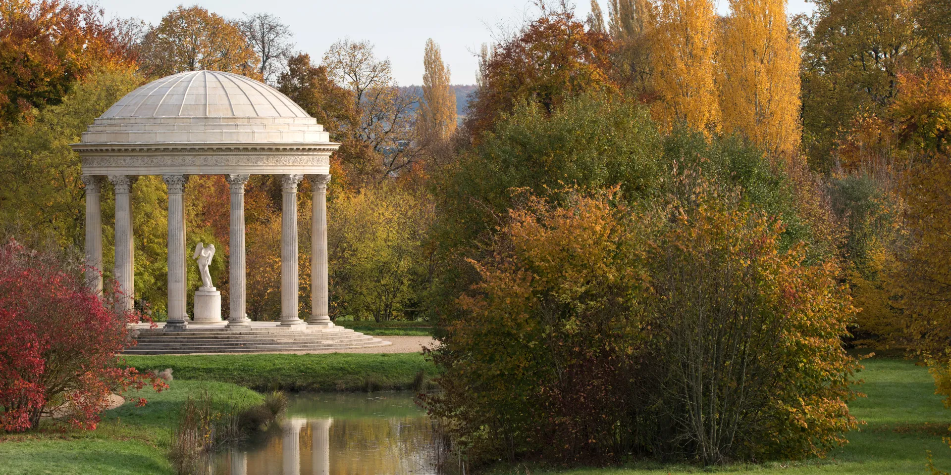 The monument, set on an island in the river, stands atop a circular platform with seven steps. Twelve Corinthian columns are topped off with a low-profile cupola of Conflans limestone, covered with lead and painted to resemble wood. The underside of the cupola features sculpted caissons and rosettes arranged around a central panel sculpted by Deschamps. Measuring some two metres in diameter, this centrepiece features a quiver, arrows and flaming embers, interwoven and adorned with roses and olive branches. The entablature is composed of an architrave whose soffit sections are adorned with rosettes and Arabesque scrolls, inside and outside, along with a composite cornice. The floor of the monument was designed by marble craftsman Le Prince, incorporating veined white, Languedoc red and Flanders marble. Construction started immediately and concluded in July 1778. The masonry is the work of Guiard. As the centrepiece of this new monument, the queen turned down the sculpture proposed by Deschamps and instead installed a copy of Bouchardon’s Cupid fashioning his bow from Hercules’ club (1750), originally intended for the Hercules Room but relegated to the Château de Choisy since 1752. Marie-Antoinette had the statue transferred to the Louvre to allow sculptor Louis-Philippe Mouchy to produce a copy. Mouchy’s copy was removed from Le Trianon during the Revolution and spent some time at Saint-Cloud before being returned to its original location in 1816. The Love Monument was thoroughly restored in 2006.