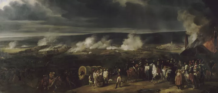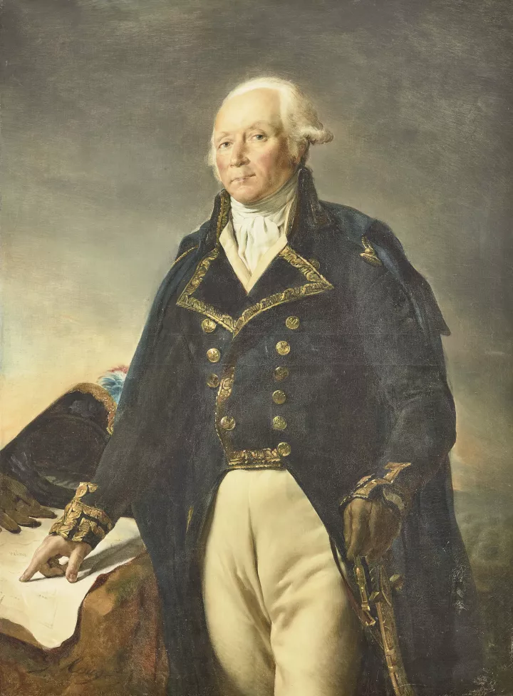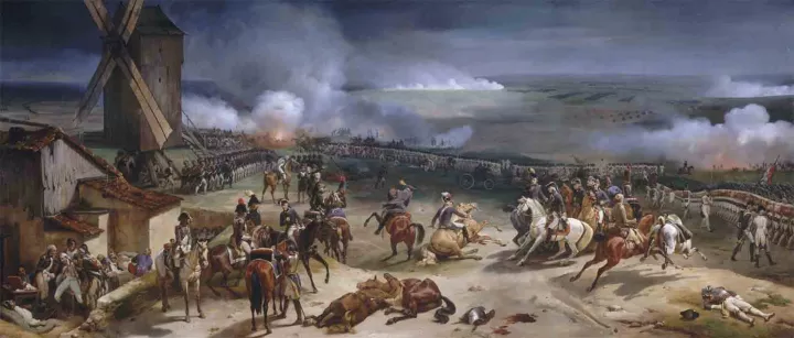 The main paintings evoke the call to arms to defend “the imperilled nation” - The National Guard of Paris Leaves to Join the Army in September 1792 by Léon Cogniet – and some of the most emblematic battles of the Revolution – The Battle of Valmy, 20 September 1792, by Mauzaisse after Horace Vernet, and The Battle of Jemmapes, 6 November 1792, by Henry Scheffer after after Horace Vernet - and the many military commanders who led France to victory.