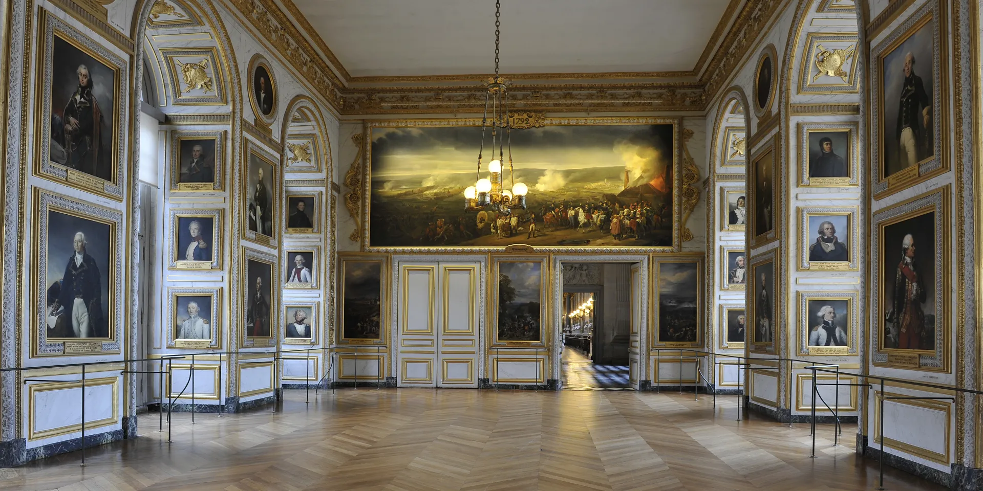 Kellermann, Dumouriez, Luckner, are featured alongside Rochambeau, a veteran of the American Revolutionary War; La Fayette, its most famous combatant; and Louis-Philippe himself, who fought in Valmy and Jemmapes. The portraits of the Empire’s future heroes line the archways around the windows, and Napoleon has pride of place, above the entrance.