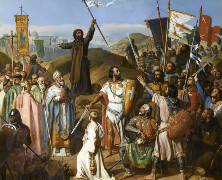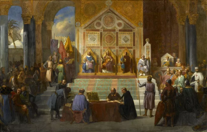 The five Crusades Rooms tell the story of the eight main crusades, between the end of the 11th and the end of the 13th century. They also recount the main events in the history of the Knights Hospitaller, from their departure from the Holy Land at the end of the 13th century, until their arrival on the Island of Malta in the 16th century. The 125 paintings in these rooms, inset into the wood panelling, were produced by many historical and portrait painters living in Paris at the time: Delacroix, Granet, Blondel, Larivière, Schnetz, Signol, Odier etc. There are also works by young artists from other countries who came to France for training: the two main representatives of the first romantic school in Belgium, Louis Gallait and Gustaf Wappers, as well as a promising young Spaniard, Federico de Madrazo y Kunst.