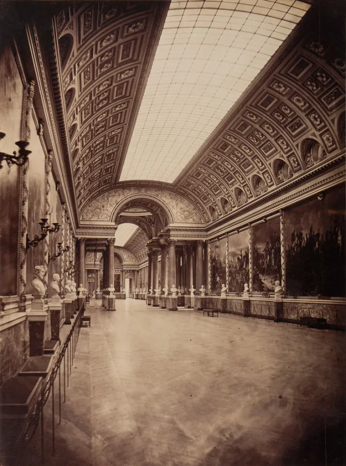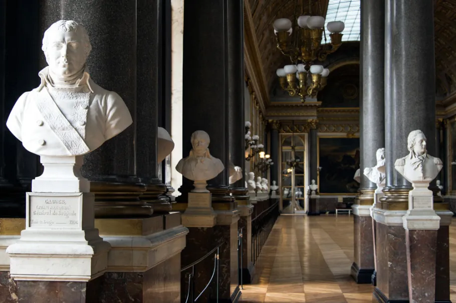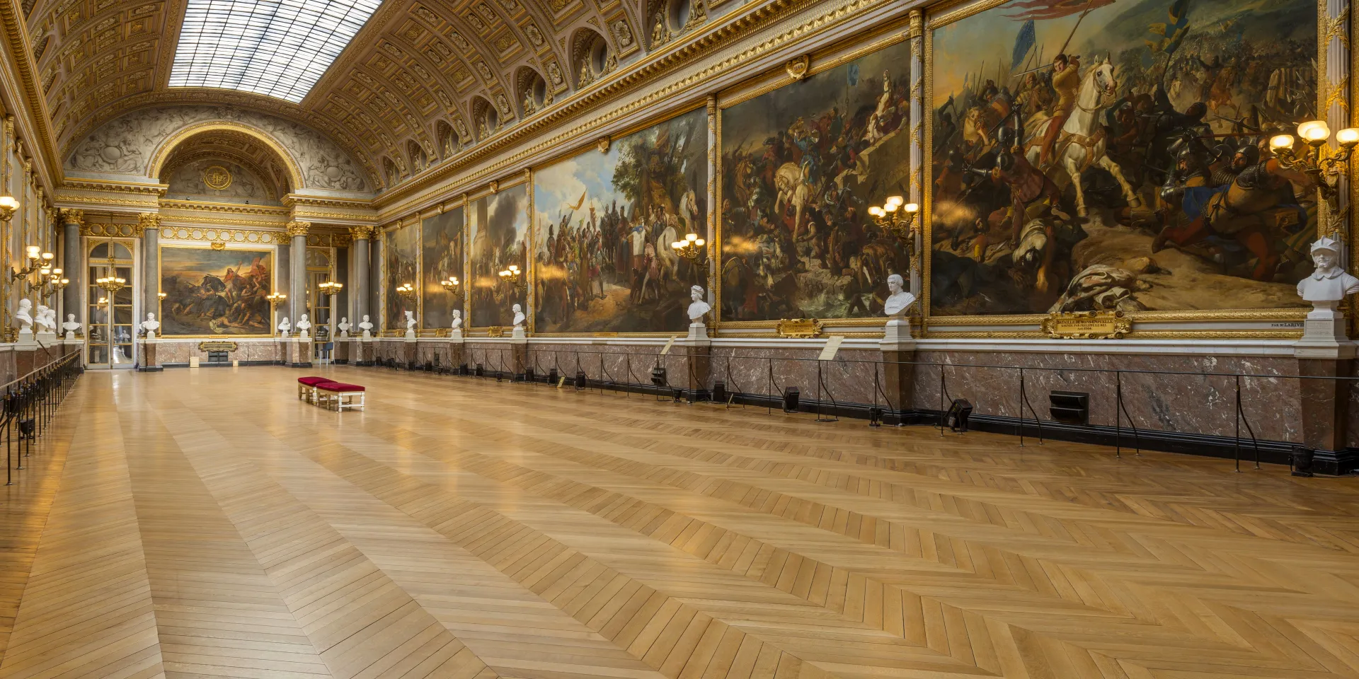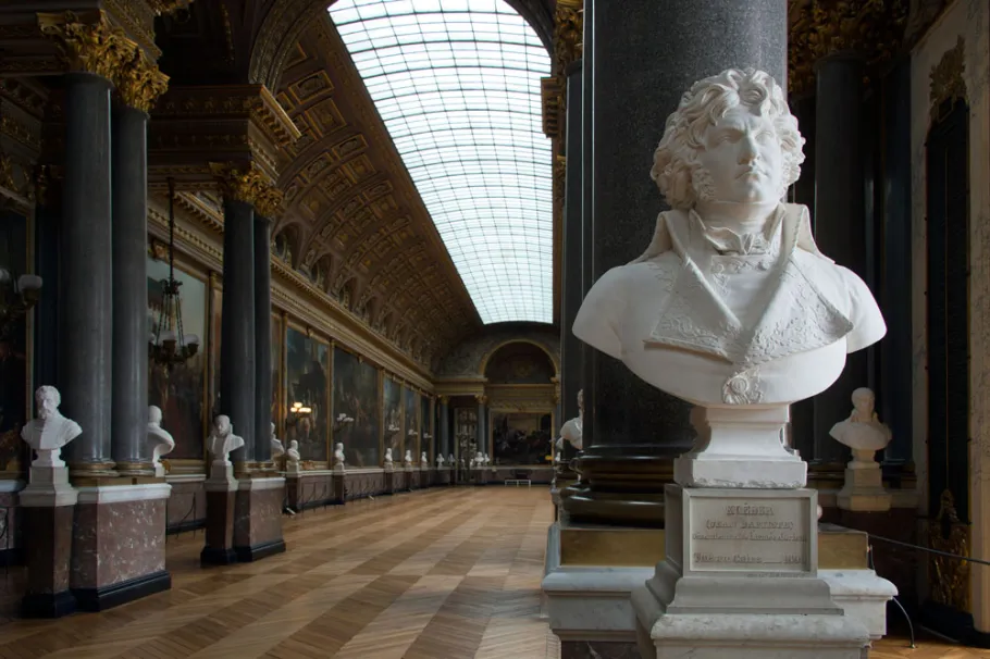All the other works were created specially for the Gallery between 1834 and 1845 by great historical painters of the time including Alaux, Bouchot, Couder, Delacroix, Devéria, Féron, Fragonard son, Franque, Heim, Larivière, Mauzaisse, Picot, the Scheffer brothers, Schnetz, Schopin, Steuben and Vernet. The gallery’s architecture, designed by Frédéric Nepveu and almost certainly with advice from Pierre-Léonard Fontaine, evokes the latter’s projects for the Grande Galerie in the Louvre during the Consulat and the Empire. It was a solemn space punctuated with avant-corps of columns, lit up by glass ceilings in the vault and finely decorated with marble and painted and gilded stuccos. The Gallery was also designed as a Pantheon to national glory, with a series of 80 busts of officers killed in combat, as well as tables in bronze bearing the names of princes, constables, Maréchals and admirals also killed or wounded for France.