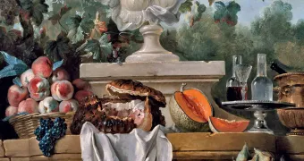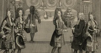 There was a large number of dishes, which were brought to the table in “services” at staggered intervals. The soup and starters were followed by roasts and salads, then puddings and finally fruit. With each service a different procession of officers from the Services for the King’s Mouth brought in dishes in gold, silver or silver-gilt. The best goldsmiths worked to produce new forms that would keep the food warm for longer. Glasses, which were ordinary items, were only provided upon request. The meal lasted less than an hour.