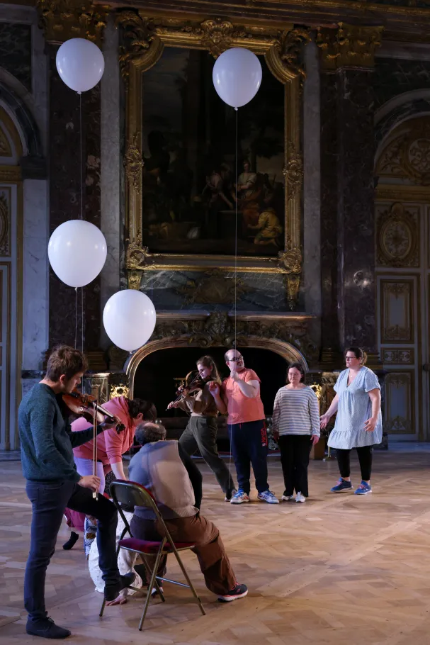 A dozen rehearsals took place between the Conservatoire de Trappes and body expression spaces at the Palace of Versailles. The dancers also visited the Royal Opera to familiarize themselves with the space.