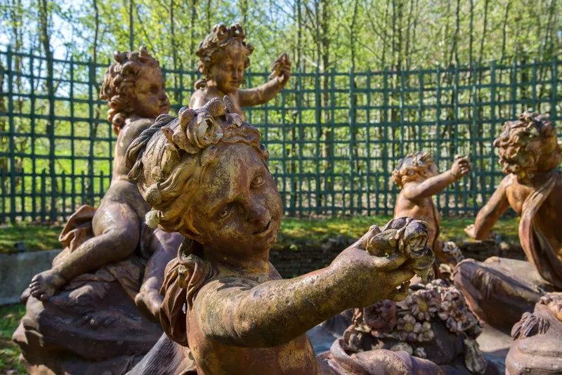 Situated just next to the Water Theatre Grove, to the north of the Versailles Park, today's Golden Children's Fountain was created by Jules Hardouin-Mansart after 1704. The centre of this small oval-shaped pool is adorned with a group of lead cherubs, made in 1704 by Jean Hardy and originally intended for the pools in the park at Marly, but in the end transferred to Versailles in 1709. A veritable masterpiece of lead statuary in the gardens of Versailles, it testifies to Louis XIV's fondness for childhood following the death of a number of his descendants, which cast a shadow over the end of his reign.