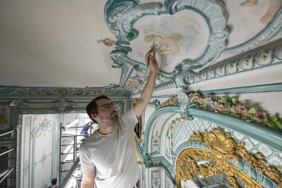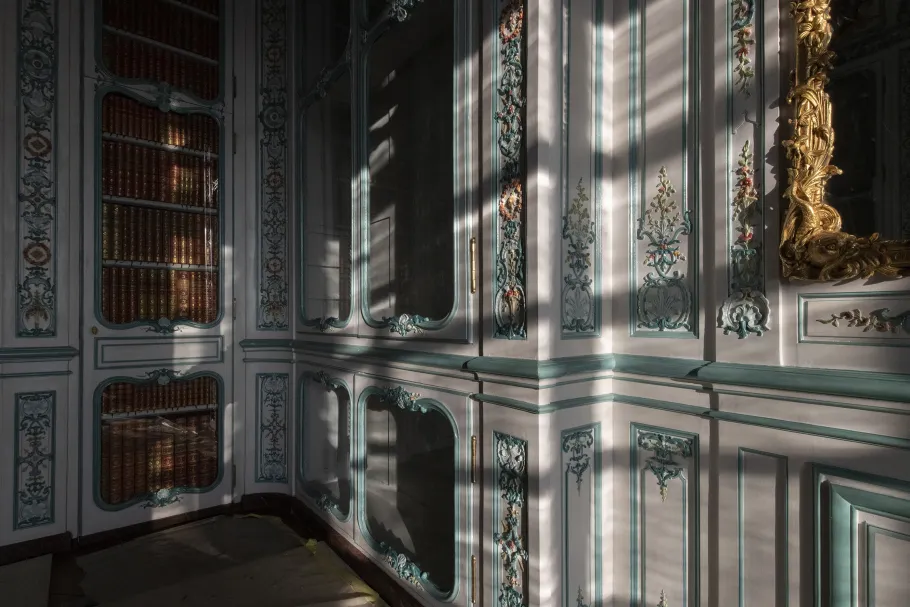 Located next to the Great Chamber, the library began being used as such around 1755-1756. It still retains most of its original layout and rococo-style décor, featuring garlands of flowers, dolphins and illustrations on the subject of the arts (architectural and painting trophies, dancing putti). Multicoloured and created using the French varnish technique (‘vernis Martin’), it is a perfect example of the natural-look painted décors that were popular in the mid-18th century. During the restoration of this private space, particular attention will be paid to the wood panelling, in light of the findings of an extensive study of the painted décor, which confirmed the theory that it had been improperly interpreted during a previous attempt in the 1960s. Moreover, the décor we can see today looks yellowed and distorted. The background will therefore be reworked to restore the porcelain look of the panels.