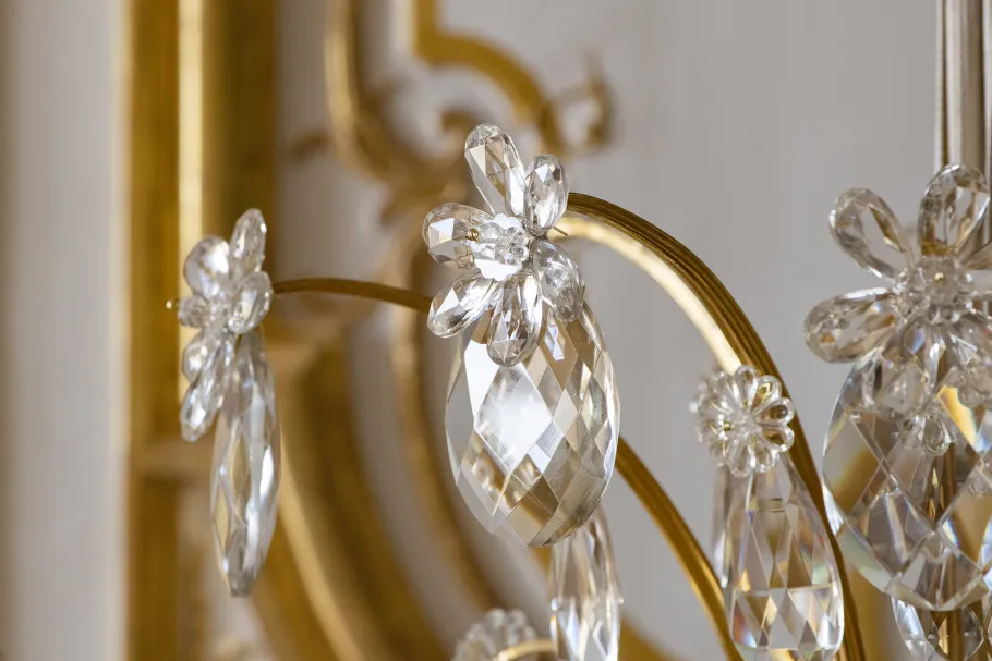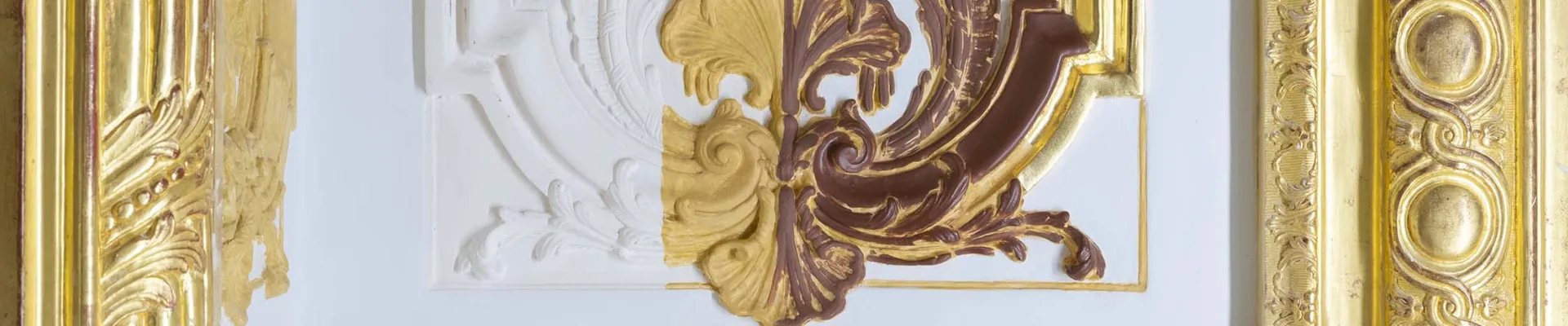 During the restoration of 1747, the Dauphin’s bedchamber was decorated by the great artists of the time, such as Jacques Verberckt, who carved the wood panelling based on designs by Ange-Jacques Gabriel, and Jean-Baptiste Pierre, who did the overdoor paintings (these works are held in the Palace of Versailles collections and will be put back in place once this restoration is complete). The room was completely transformed under Louis-Philippe and part of the décor was replaced with paintings set into the walls. In the 20th century, the wood panelling and gilding were restored, and the fireplace, which was discovered in storage, was replaced. Today, this room is one of the most opulent and best preserved in the princely apartments, and much of its original décor is considered a masterpiece of rococo art. The current project aims to restore the brilliance of the beautifully crafted gilded wood panelling, which is clogged with grime and full of gaps. The restoration will endeavour to clean the existing décors and fill in the gaps, while respecting their original appearance, and then enhance them by repainting the plain ‘blanc de Roi’ backgrounds using standard techniques.