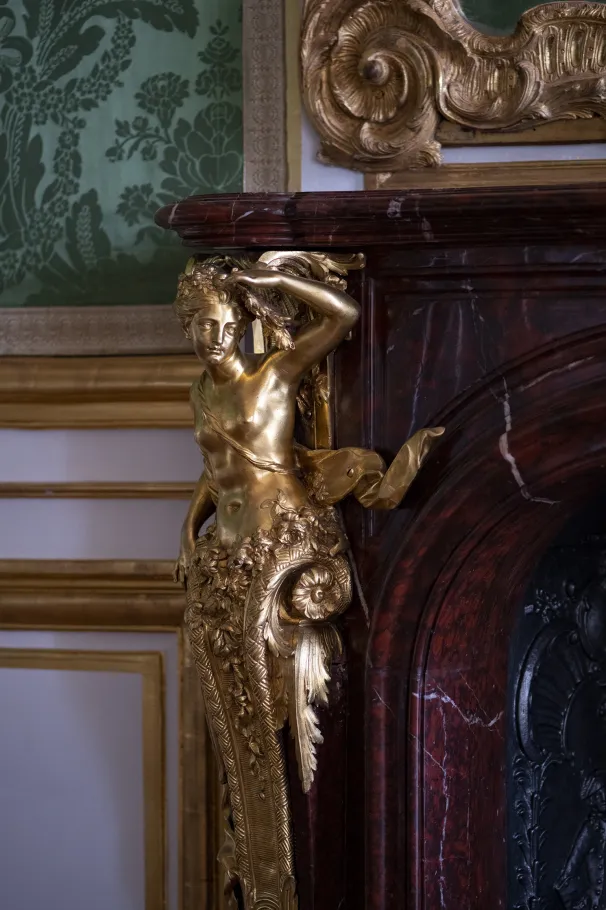 The Great Chamber is the corner room, located in the centre of the apartment. Its décor was entirely refurbished in 1747 with the assistance of sculptor Jacques Verberckt, who was responsible for the rococo wooden panelling. Only the fireplace and part of the carved panels remain today. It was at the turn of the 19th century, as the Palace of Versailles was being transformed into the museum envisioned by Louis-Philippe, that the room underwent the greatest changes, with most of its décor being replaced. In 1978, the Museums Programme Law initiated the restoration of the Dauphin’s Great Chamber to how it was during the Ancien Régime; this is how we know it today. The current project aims to complete this programme of work, which was left unfinished.