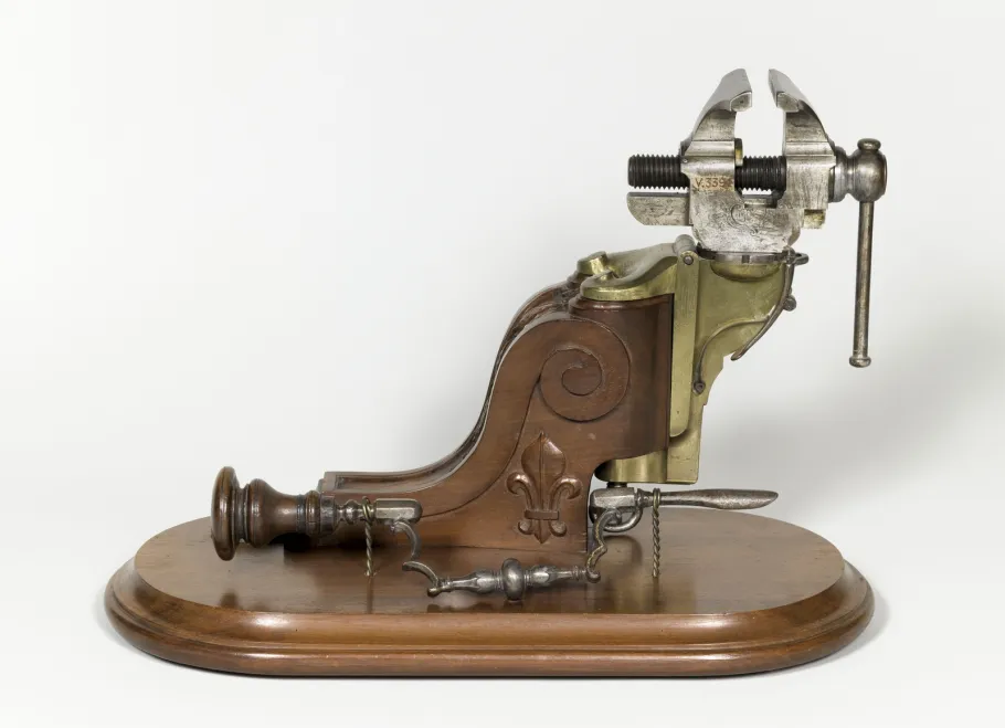 Louis XV's interest in clock-making, locksmithing and wood turning is well known. The extraordinary secretaire in three parts, now lost, made by Roentgen and equipped by Mercklein with mechanisms enabling the user to play up to twelve different organ compositions, illustrates the culmination of these skills. Installed after 1780 in the former after-the-hunt room, it was a reminder of the king's fancy for technical masterpieces, and the support he provided for the artisans who produced them.