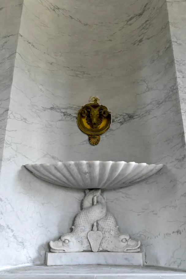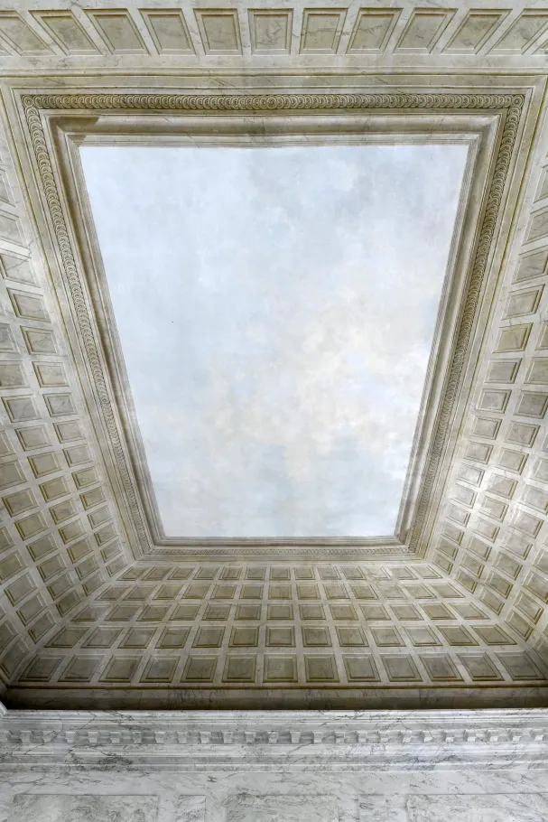 The floor is paved with marble flagstones. The walls were painted in faux-marble upon the restoration carried out during the First Empire. They are capped with a protruding cornice, also painted in faux-marble, which serves as the base for a vaulted plaster ceiling embellished with decorative coffers framing a trompe-l’oeil painting of the sky. Marble furnishings, including a central table and wall-mounted side tables, round out this exceptional interior design.