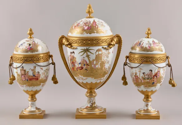 The relationship between the two resulted in the Getty Center being loaned a set of lacquer boxes from Marie-Antoinette’s collection in 2018/2019 (A Queen’s Treasure from Versailles: Marie-Antoinette’s Japanese Lacquer, January 2018 - January 2019). The loan of this garniture of “egg-shaped” vases commissioned for Marie-Antoinette serves to deepen this partnership further still.