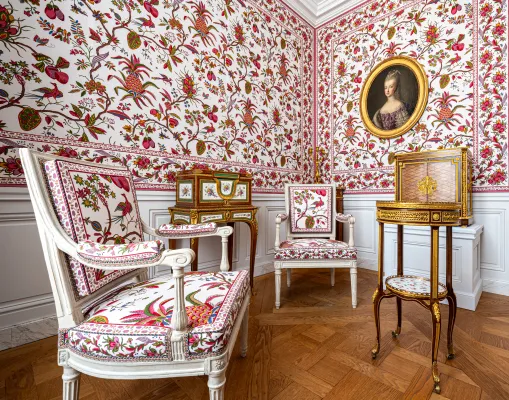 As of 1774, the queen laid out a series of smaller rooms directly above. These spaces were reserved for her personal use, as well as for her Principal Chambermaids and servants. The two storeys were connected by narrow staircases, including the Billiard Staircase, located behind the alcove in the Queen’s Bedchamber. Following extensive archival research into the use and hierarchy of these rooms, as well as the appearance and production of the original Toile de Jouy fabrics during the reign of Marie-Antoinette, these rooms will all be restored, refurnished and embellished with new fabric adornments.